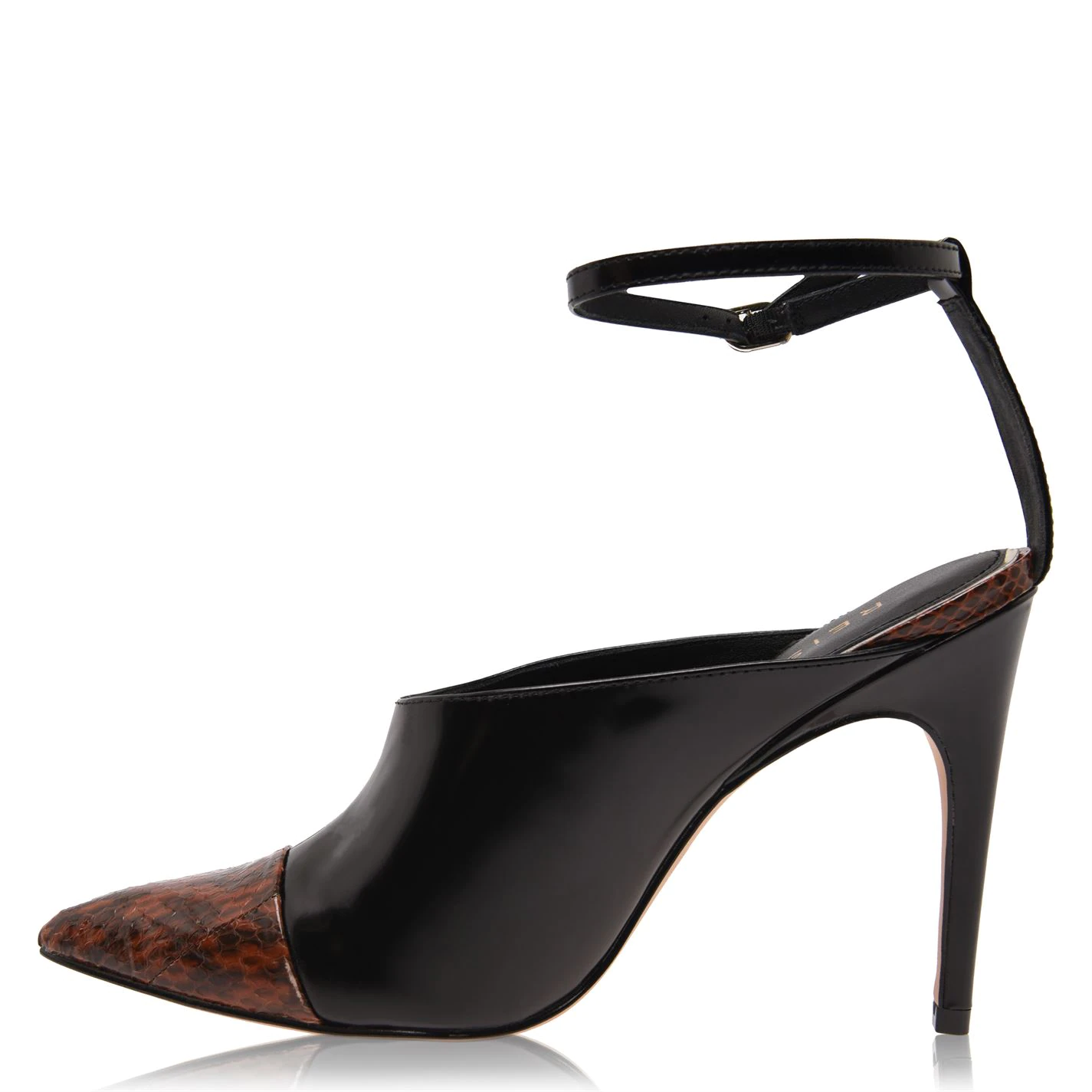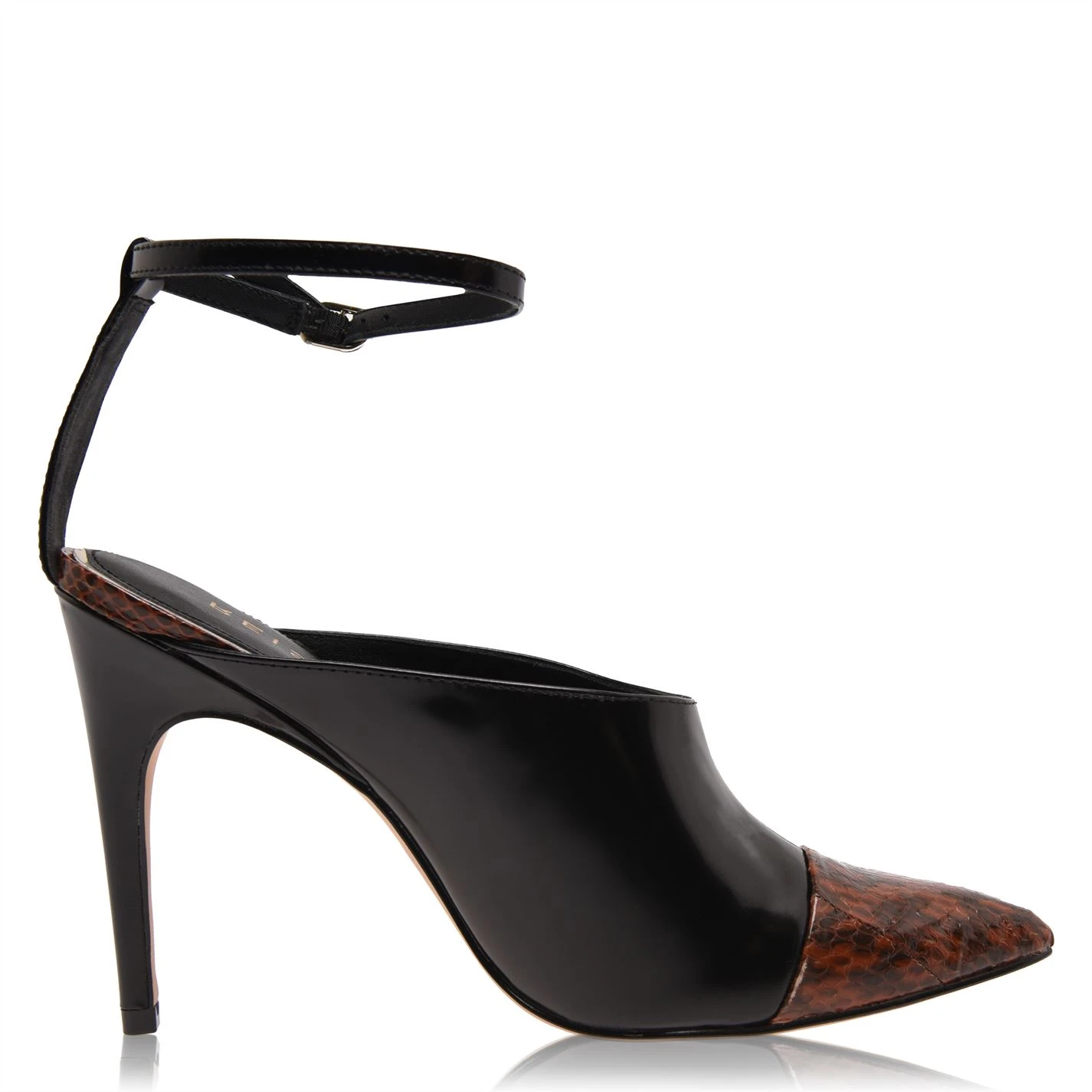 Step it up at your next outing in these Malika Stiletto Heels brought to you by Reiss. Produced from pure leather this 10.5cm stiletto heel shoe offers a sharp pointed toe design that contours the shape of your foot. There is no back with ankle strap fastening to further secure your feet and solid colour across the smooth exterior on these heels with contrast soles and snake print to the toe for a premium feel with every step.